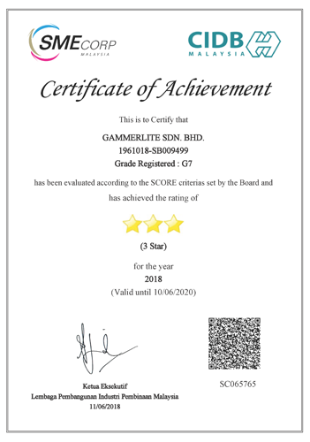On 5th January 2001, we were the first batch of Contractors from Sabah to participate in the CIDB ISO 9000 DIY Scheme. On 21st April 2006 Gammerlite Sdn Bhd obtained ISO 9001:2001.